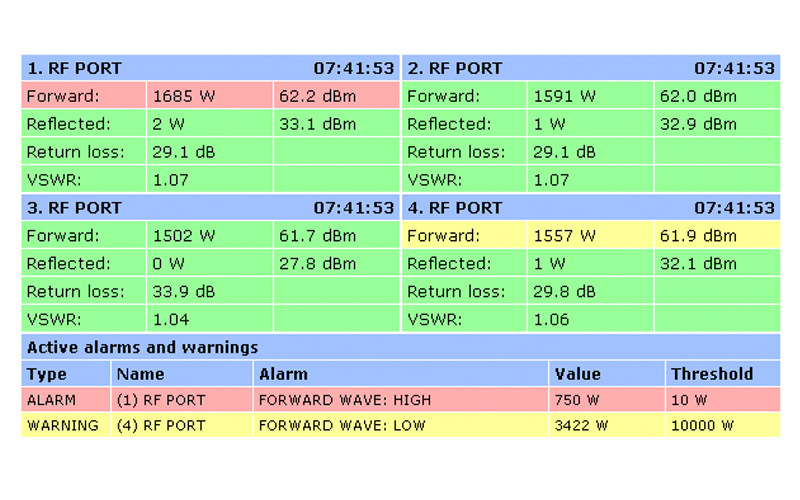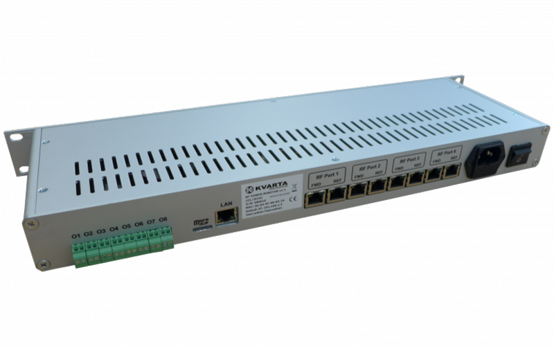The RF POWER MONITOR can control up to 8 external RF measuring probes. It measures reflected and forward power and calculates VSWR. The instrument has a user-friendly website management as well as SNMP support to allow network management. The RF power monitoring device can be configured for VSWR and Power limits to give alarms as SNMP traps or sending e-mail alarms. All alarms are logged and time stamped to the onboard micro SD card. The RF Power Meter allows you to control your RF network installation from transmitters to the antenna.